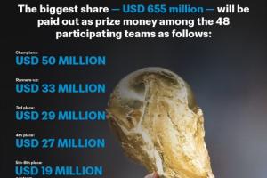 体育资讯12月18日讯 国际足联官方昨日公布2026世界杯的奖金分配方案,奖金总额7.27亿美元,冠军奖金5000万美元,参赛即可拿1050万美元。