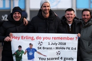 拉德林格提到了2018年哈兰德身披莫尔德球衣对阵布兰时,对他上演大四喜的往事。牌子上写道:“嗨,埃尔林,你记得吗?2018年7月1日,莫尔德4-0布兰,你对我打进了4球!能请你把你的球衣送给我吗?”