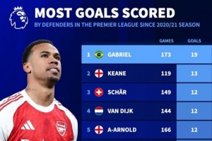 体育资讯12月31日讯 《转会市场》统计了20-21赛季以来的英超后卫进球情况,枪手中卫加布里埃尔独自领跑。
