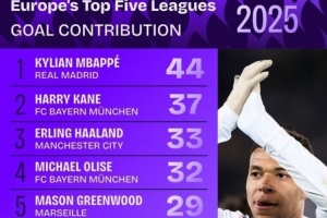 体育资讯1月1日讯 2025年已经结束,squawka也统计了五大联赛直接参与进球榜,姆巴佩独占鳌头。