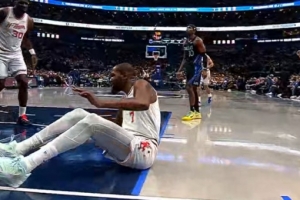 神仙手感!雷诺对抗被顶飞出底线 篮板后失衡超级高抛空心射进2+1