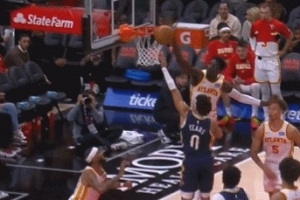 神仙手感!雷诺对抗被顶飞出底线 篮板后失衡超级高抛空心射进2+1
