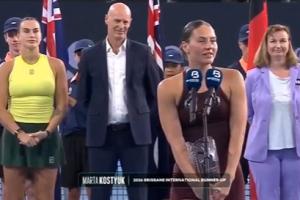 体育资讯01月11日讯 WTA500布里斯班站决赛,萨巴伦卡2-0击败乌克兰球员科斯秋克夺冠。赛后科斯秋克未与萨巴伦卡握手致意。