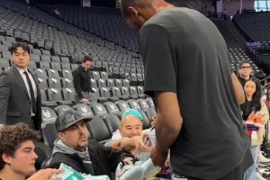 GIF-杜兰特赛前暖心为球迷签名