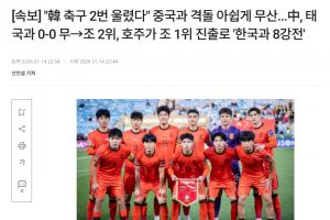 韩媒标题为:韩国足球两度饮恨 与中国对决遗憾落空(中国0-0战平泰国获小组第二 澳大利亚头名晋级将与韩国会师)