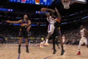 神仙手感!雷诺对抗被顶飞出底线 篮板后失衡超级高抛空心射进2+1