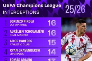 体育资讯1月23日讯 Squawka统计了球员本赛季欧冠的拦截次数,并列出榜单,琼阿梅尼、皮罗拉16次居首。