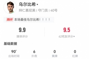 体育资讯1月29日讯 拜仁在本轮欧冠2-1力克埃因霍温,小将乌尔比希本场数据如下: