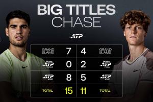 ATP官方晒出了两位00后男单代表人物阿尔卡拉斯和辛纳的重大赛事冠军数对比。