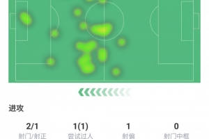 首发出场72分钟,打进1球,射门2次射正1次,过人1次,射偏1次,丢失球权6次,预期进球0.57球