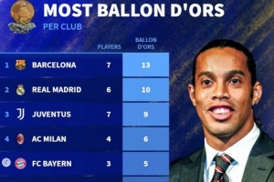 ■各俱乐部和球员夺得金球奖次数排名(括号内为人数):