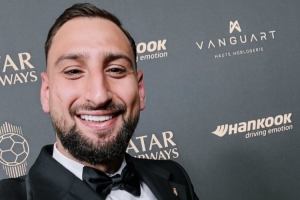 获奖后,多纳鲁马非常开心,手捧奖杯自拍。曼城官方晒出这一照片,庆祝多纳鲁马获奖。
