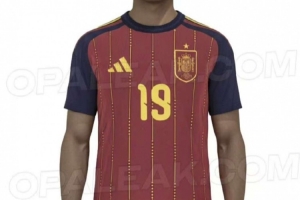 西班牙队新款主场球衣将以深红色为主体,搭配深海军蓝色的袖子,并在肩部饰有红黄红三道条纹。球衣上还大面积加入了细密的黄色竖条纹,以及点状细节装饰。