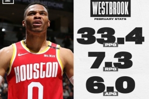接着NBA Memes晒出了2020年2月搭伙哈登时的威少的月数据,场均33.4分7.3板6助攻,投篮命中率为54.9%。