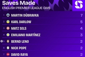 体育资讯9月24日讯 英超第5轮战罢,squawkafootball列各项数据排行,伯恩利门将杜布拉夫卡是本轮扑救次数最多的门将,共有7次。