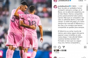 阿尔巴社媒晒出与布斯克茨的合照,并写道:“布斯克茨,能与你在巴萨、西班牙队以及迈阿密国际共用更衣室,这是我的莫大荣幸。我们几乎整个职业生涯都并肩作战。你不仅是队友,更是场上场下的榜样。你的球风与视野始终独树一帜,那些欢笑与建议将永远铭刻于心。