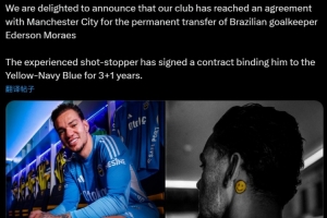 “我们非常高兴地宣布,俱乐部已与曼城就巴西门将埃德森的永久转会达成协议。这位经验丰富的门将已与我们签署了一份3+1合同。”