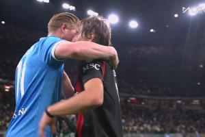 体育资讯09月29日讯 本轮十人米兰2-1击败那不勒斯,赛后,德布劳内与莫德里奇拥抱致意。