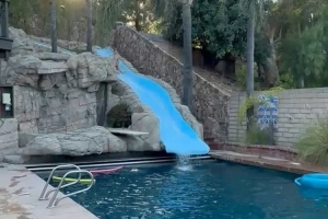 从视频中可以看到,他从滑滑梯滑下的同时命中了一记超远的投篮(上方视频),而在第二个视频(下方)中他在滑梯中失去平衡,上演了五大囧。