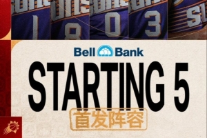 赛前太阳官方公布首发阵容:布克、阿伦、邓恩、狄龙、伊戈达罗,并在图中配上了中文“首发阵容的字样”。