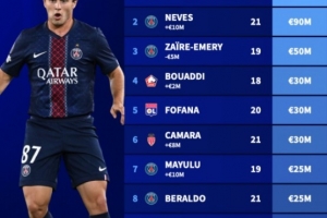 1、若昂-内维斯(21岁,巴黎圣日耳曼):9000万欧元