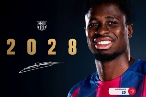 体育资讯10月16日讯 巴萨官方宣布和18岁后卫兰德里-法雷(Landry Farré)续约两年至2028年,俱乐部青训负责人霍安-索勒(Joan Soler)和青训足球总监何塞-拉蒙-阿莱克桑科(José Ramón Alexanco)出席了续约仪式。