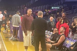 赛前,威少与湖人助教斯科特-布鲁克斯交流,两人曾在雷霆与奇才共事过。