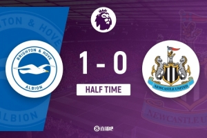 伤停补时5分钟。上半场比赛结束,布莱顿1-0纽卡斯尔。