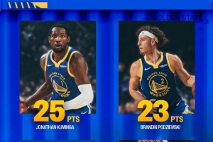 在昨日的比赛中,勇士在主场131-118击退来访的灰熊。这场比赛,勇士有四个人得分上20,其中巴特勒20分、库明加25分、波杰姆斯基23分、穆迪20分;而值得一提的是,这场比赛库里仅11次出手拿到16分,出战时间只有29分42秒。