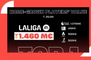 另一方面,这并未对人才保留产生负面影响。除了西甲本土球员的经济价值外,它还是给予青训营球员最多机会的联赛,在2024/25赛季,本土球员出场时间占比为19.8%,而法甲为13.5%、德甲为7%、英超为6.4%、意甲为5.5%。这些数据巩固了西班牙足球作为最佳整合本土人才的环境的地位,结合了竞技表现和经济可持续性。