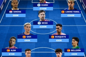 前锋:哈维-西蒙斯(8000万欧)、伊卡尔迪(1亿欧)、亚马尔(2亿欧)