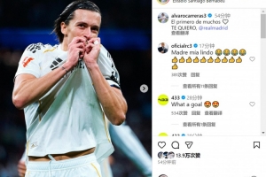 卡雷拉斯社媒晒出亲吻皇马队徽的照片,配文:“很多进球中的第一个。我爱你,皇马。”
