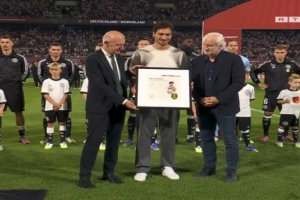 体育资讯9月8日讯 德国队在本轮世预赛主场迎战北爱尔兰,主队赛前为退役的老将胡梅尔斯举办了致敬仪式。