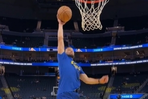 赛前,勇士球星库里进行热身,自抛自扣完成单手扣篮。