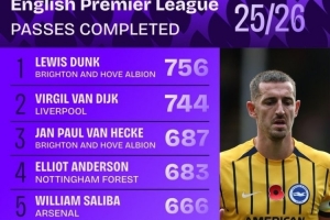 体育资讯11月11日讯 英超联赛已经进行了11轮,squakwa也统计了本赛季英超成功传球榜,中场球员仅埃利奥特·安德森和苏维门迪。