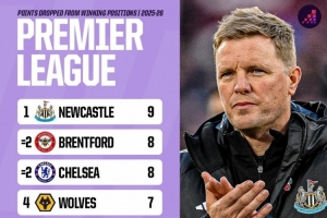体育资讯11月11日讯 Opta统计了本赛季英超球队领先之后丢掉的积分,并列出榜单,纽卡9分最多,布伦特福德、切尔西8分次席。