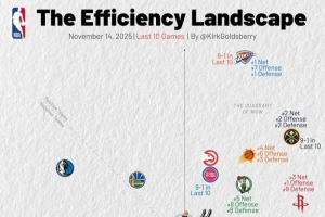 横轴代表进攻效率,越靠右越好,纵轴代表防守效率,越靠上越强。第一象限的球队多为发挥出色的球队,而在第三象限的球队通常为战绩比较糟糕的球队。