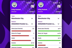 体育资讯11月18日讯 Squawka统计了哈兰德22-23赛季(英超36球创纪录)和本赛季的数据,并做出对比。