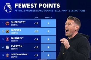 南安普顿(24/25赛季12分)、桑德兰(05/06赛季15分)、谢菲联(23/24赛季16分)也是此前的英超单赛季积分倒数前四。