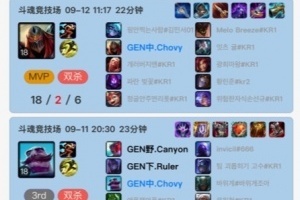 体育资讯9月12日讯 根据韩服排位统计小程序显示,Chovy中午登上韩服打了一把斗魂竞技砍下MVP后美美下线。