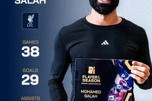 萨拉赫在上赛季为利物浦出战的38场英超比赛中打进29粒进球,并送出18次助攻。
