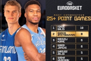 据统计,字母哥在欧锦赛已经连续8场得分25+,历史第二长,第一长的是希腊传奇加利斯(连续19场)。