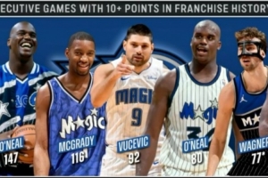 连续10+场数榜:奥尼尔147、麦迪116、武切维奇92、奥尼尔80、小瓦格纳77、班凯罗73