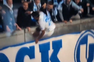 在马格德堡客场2-0击败柏林赫塔的比赛中,这位法国进攻球员在伤停补时进球后转向客队看台庆祝,跳过看台前的栏杆,却出乎自己意料地掉进了一个2.7米深的沟里。